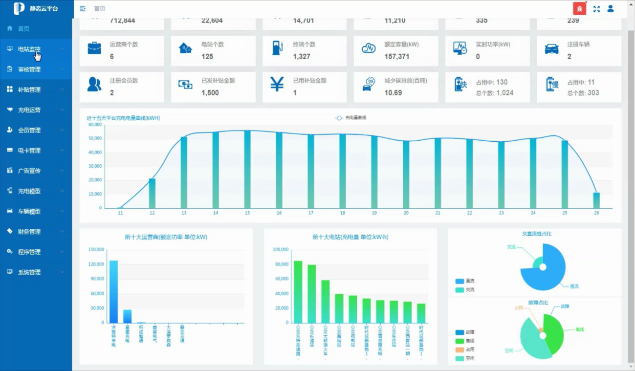 新能源充電設(shè)施監(jiān)管服務(wù)系統(tǒng)具備運營商審批備案、個人及企業(yè)購車補貼、企業(yè)評級、電站驗收等功能,實現(xiàn)對全市充電站數(shù)據(jù)的匯總監(jiān)管,補貼下發(fā)、掃碼充電、補貼使用、余額查詢等。